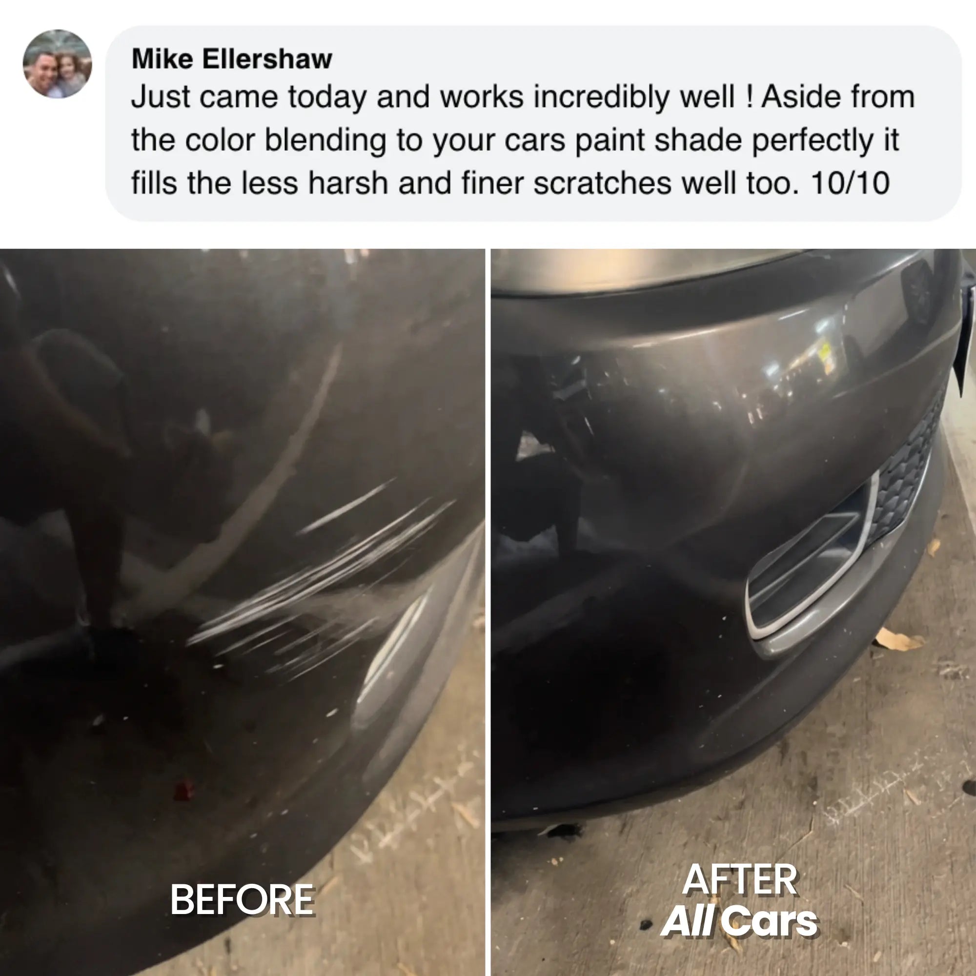Apply it on the scratch, wipe the excess, and it disappears. Your car looks like new again.